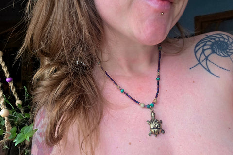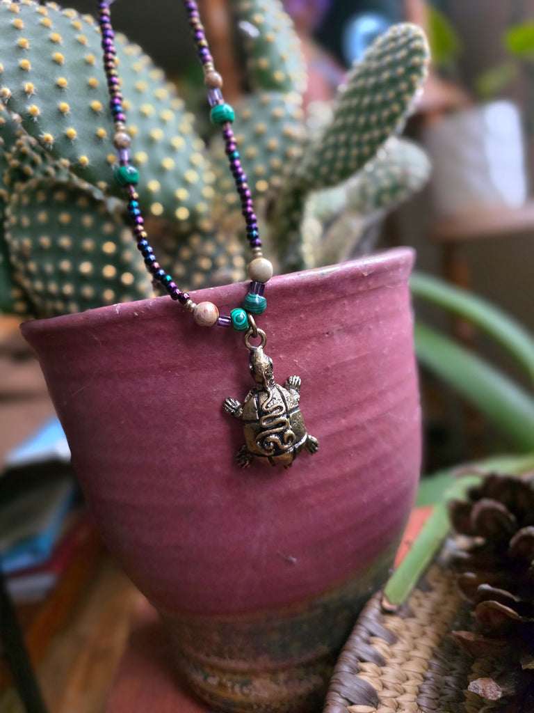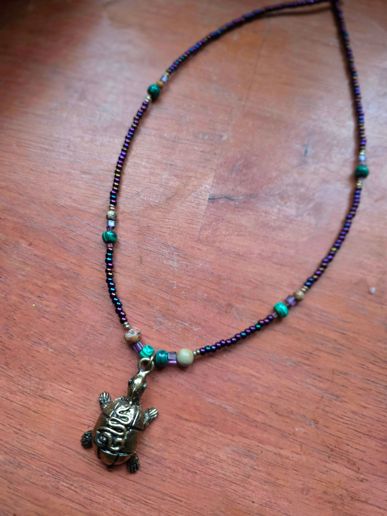 Return to Roots necklace. Turtle and serpent charm. Malachite and Jasper stone with traditional/native made beads.